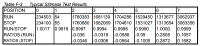 The RS test produces a report on the operation of the Slit Mask Motor by taking measurements in the “Running” and “Stopped” modes of the Slit Mask Motor. The test results are recorded in the RSOAVG file. RS values consistently outside the range of 0.997 to 1.003 for Slit Mask positions 2 to 6 should be investigated.